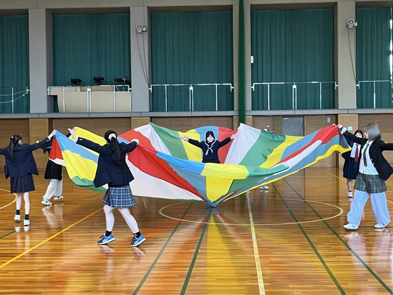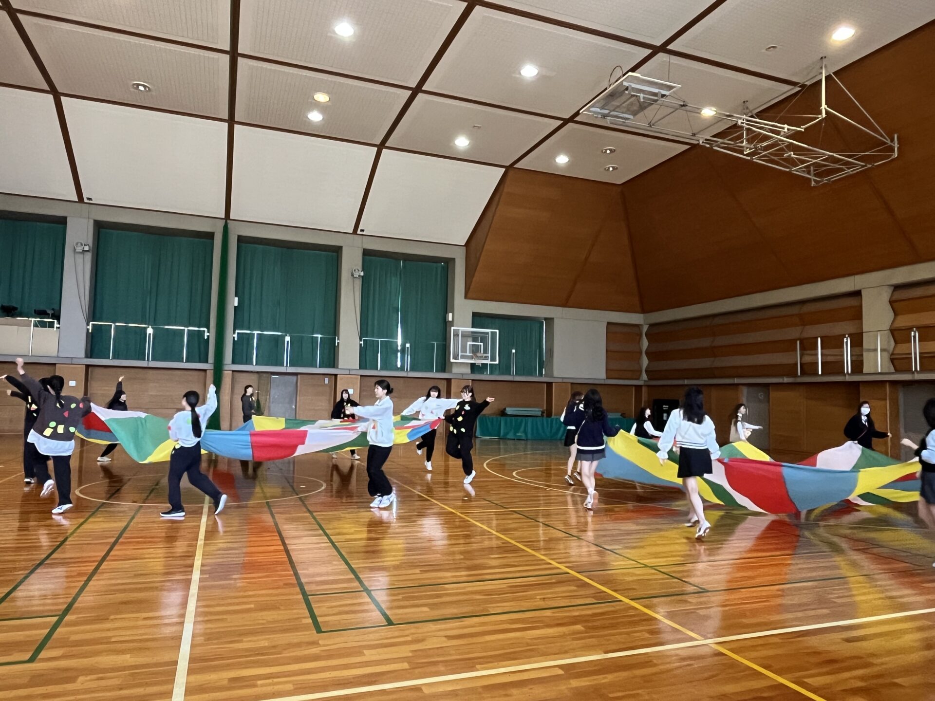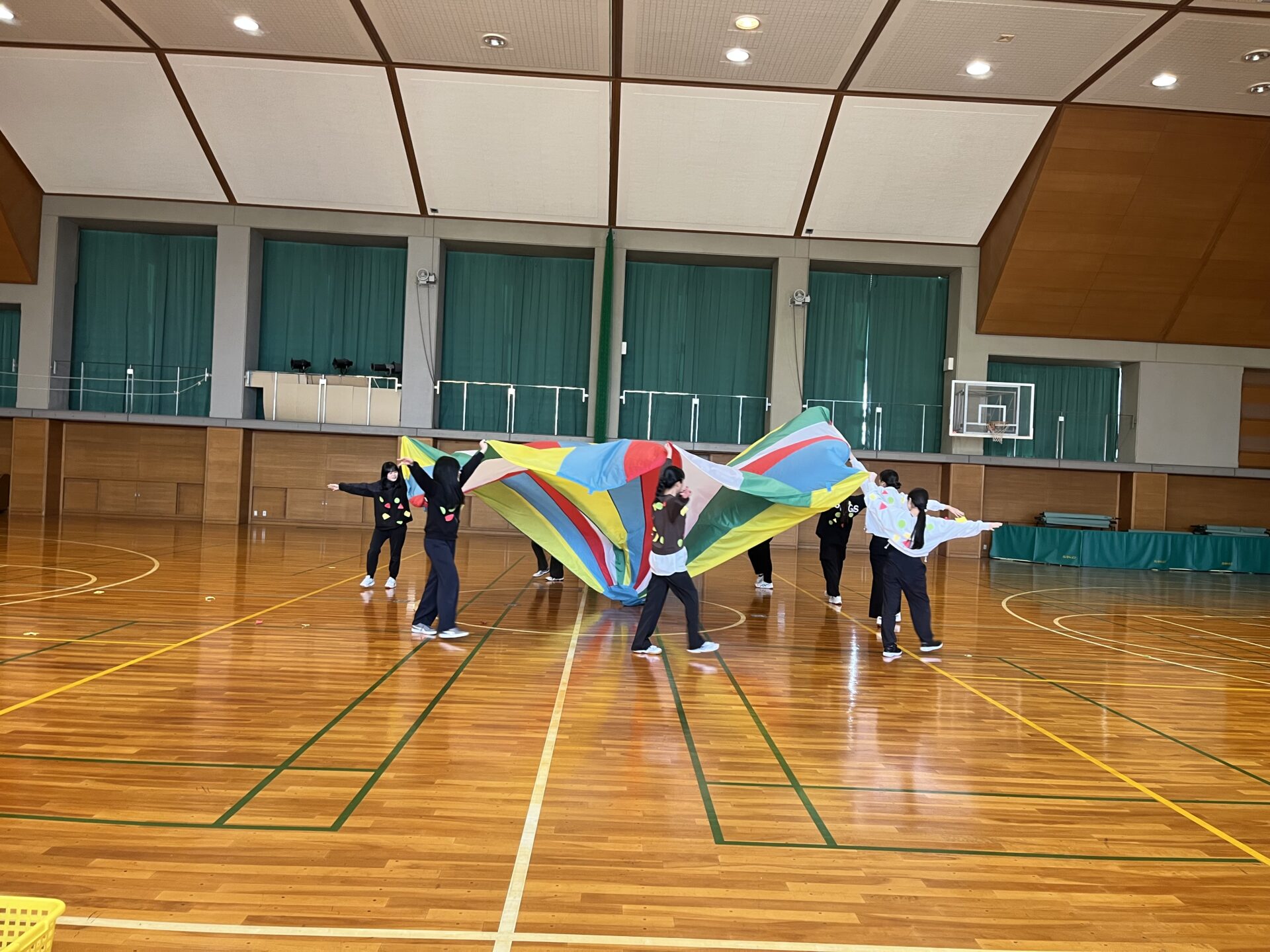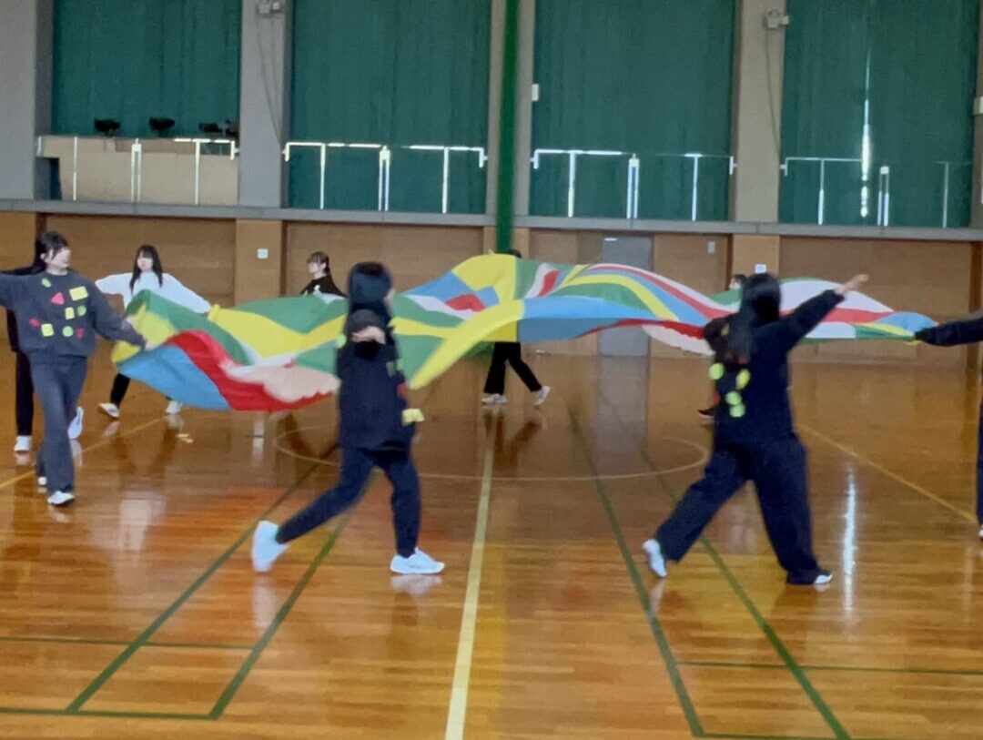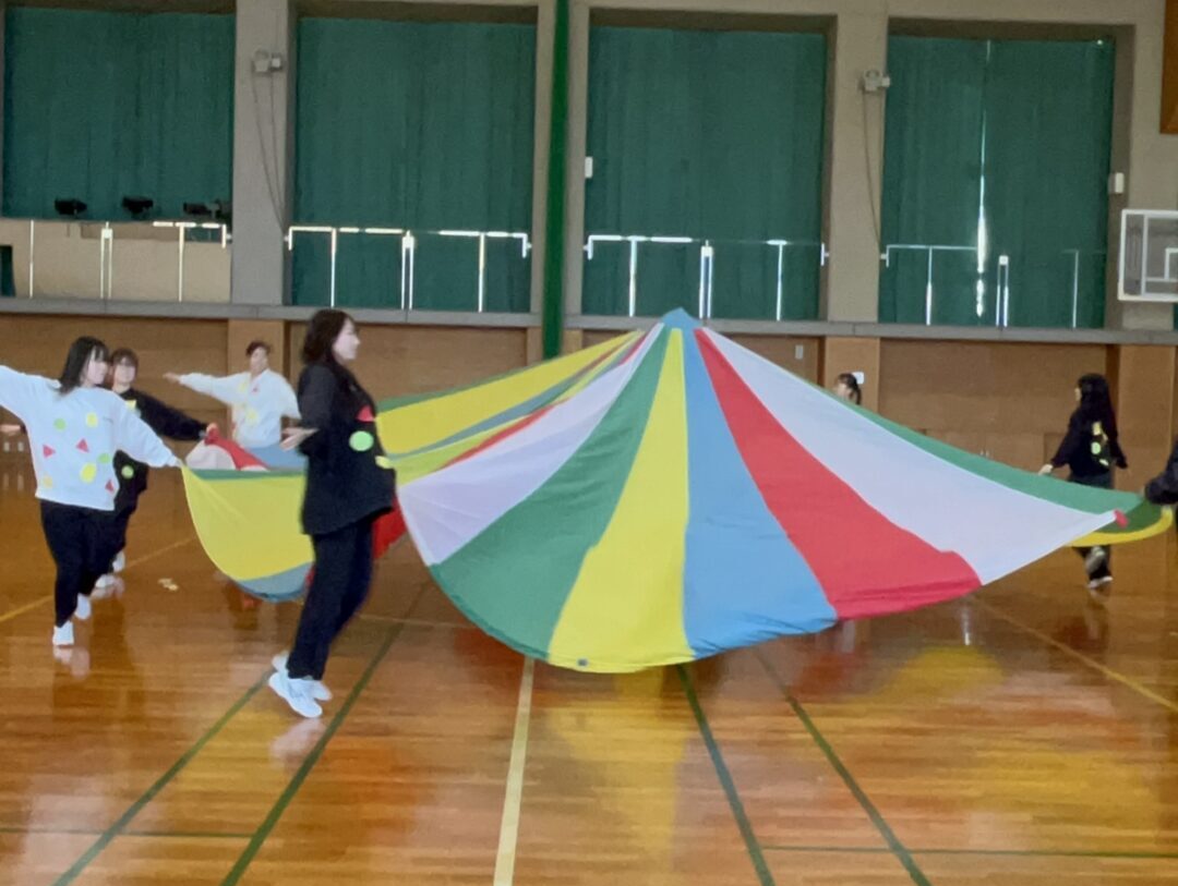 今年も、色とりどりの大きな布がふわりと舞い上がる「パラバルーン」の季節がやってきました。協力・リズム・楽しさが自然と生まれるこの活動は、学生たちの表情を一気に明るくしてくれます。パラバルーンは、動き方や声かけ一つで子どもの反応が大きく変わるため、指導法を考える良い学びの機会にもなっています。領域「健康」の授業では、学生たちが自分たちで構成を考え、実際に発表まで行いました。まさに、本学ならではの実践的な学びがつまった時間となりました。