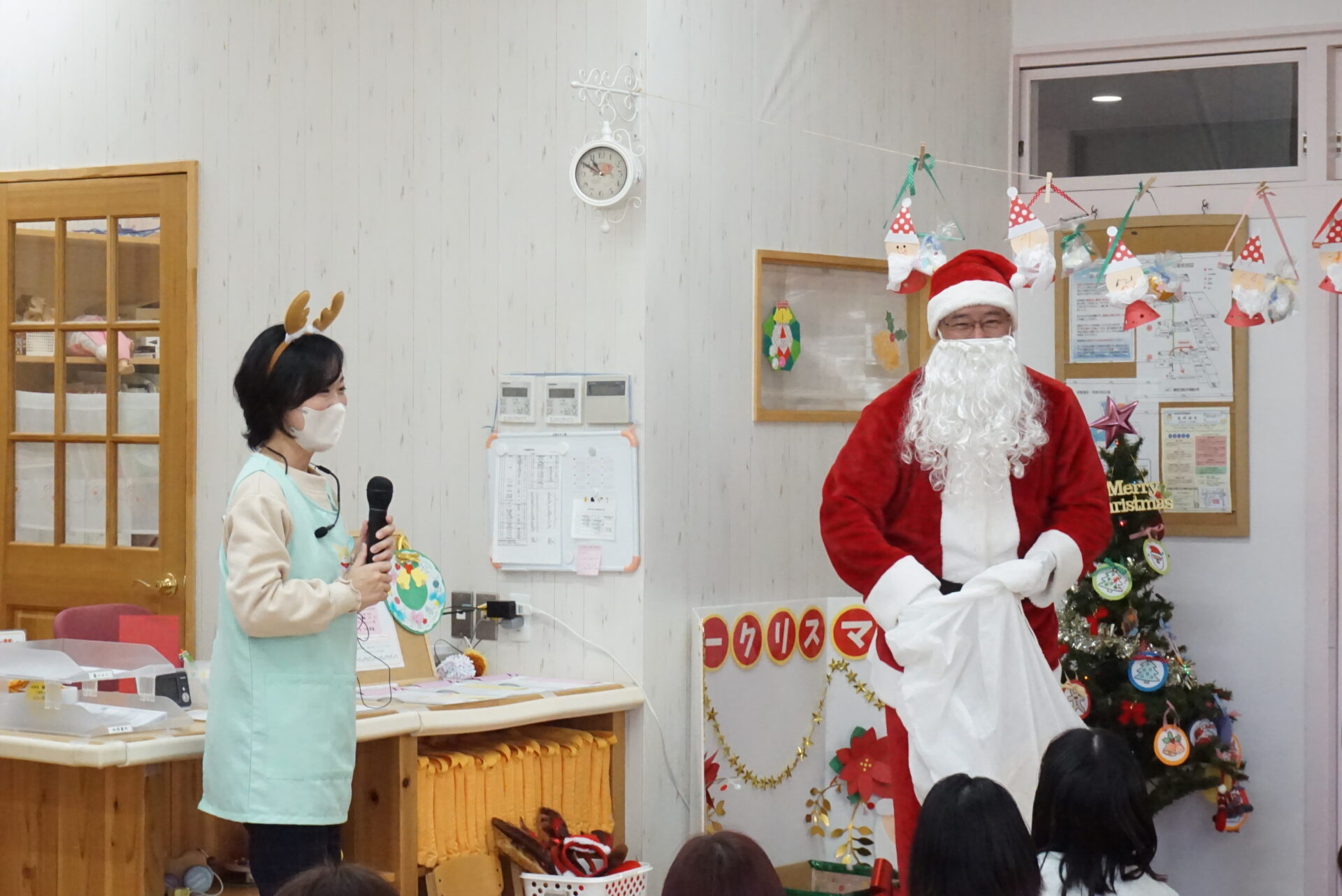 文教おやこ園での0歳児対象のクリスマス会では、1部1年の学生さんたちが自主実習で準備してくれたプレゼントを手に、なんと学長先生がサンタクロースに変身して登場!会場は赤ちゃんたちの可愛らしい反応で終始にぎやか。笑顔いっぱいで、癒しの時間となりました。