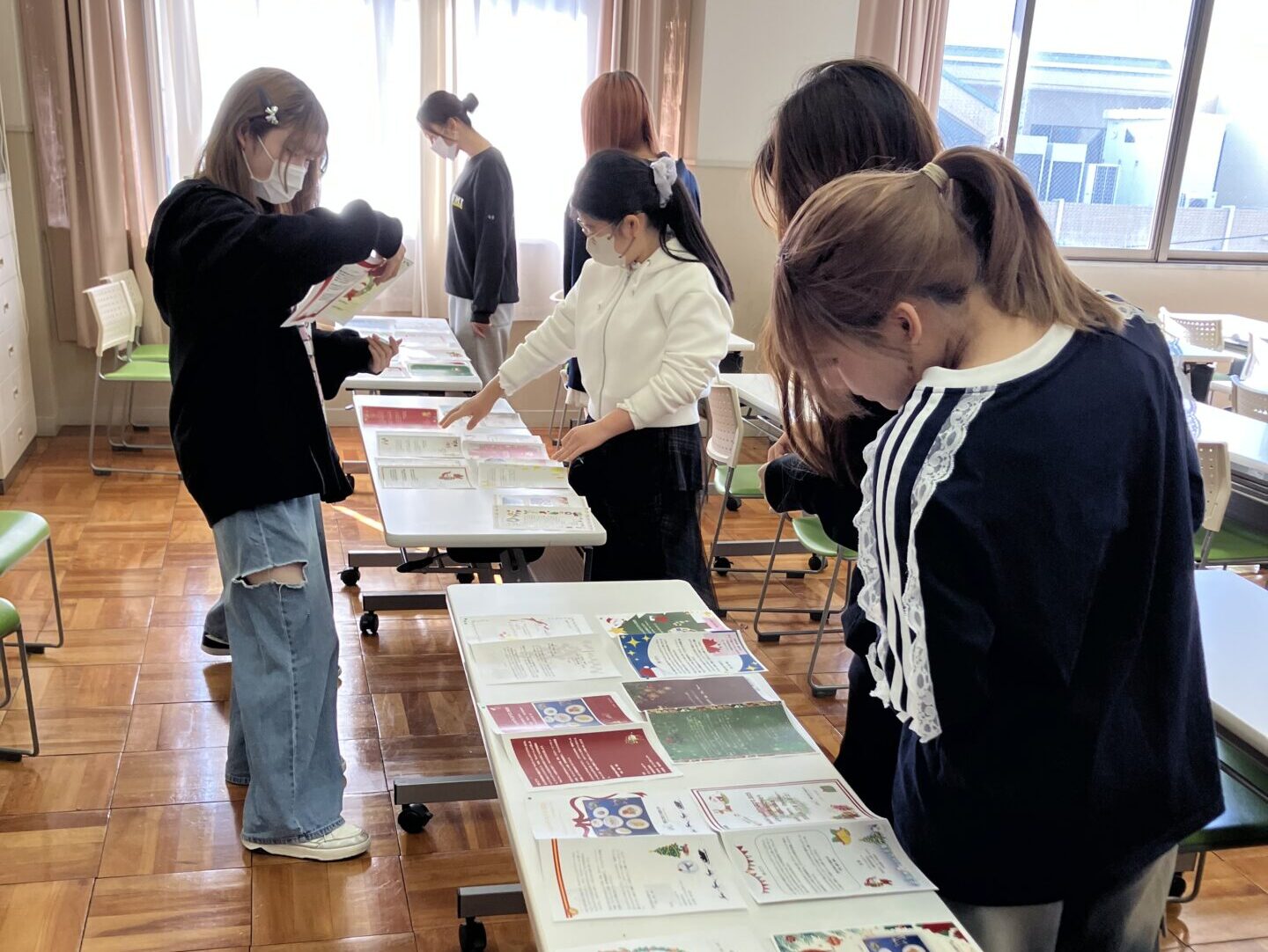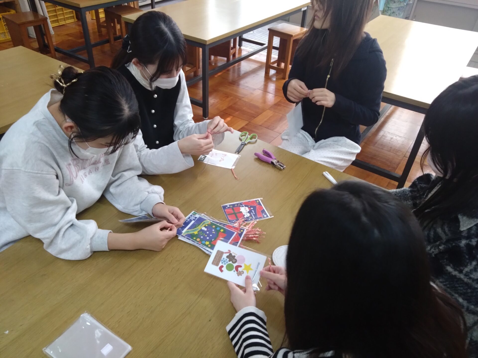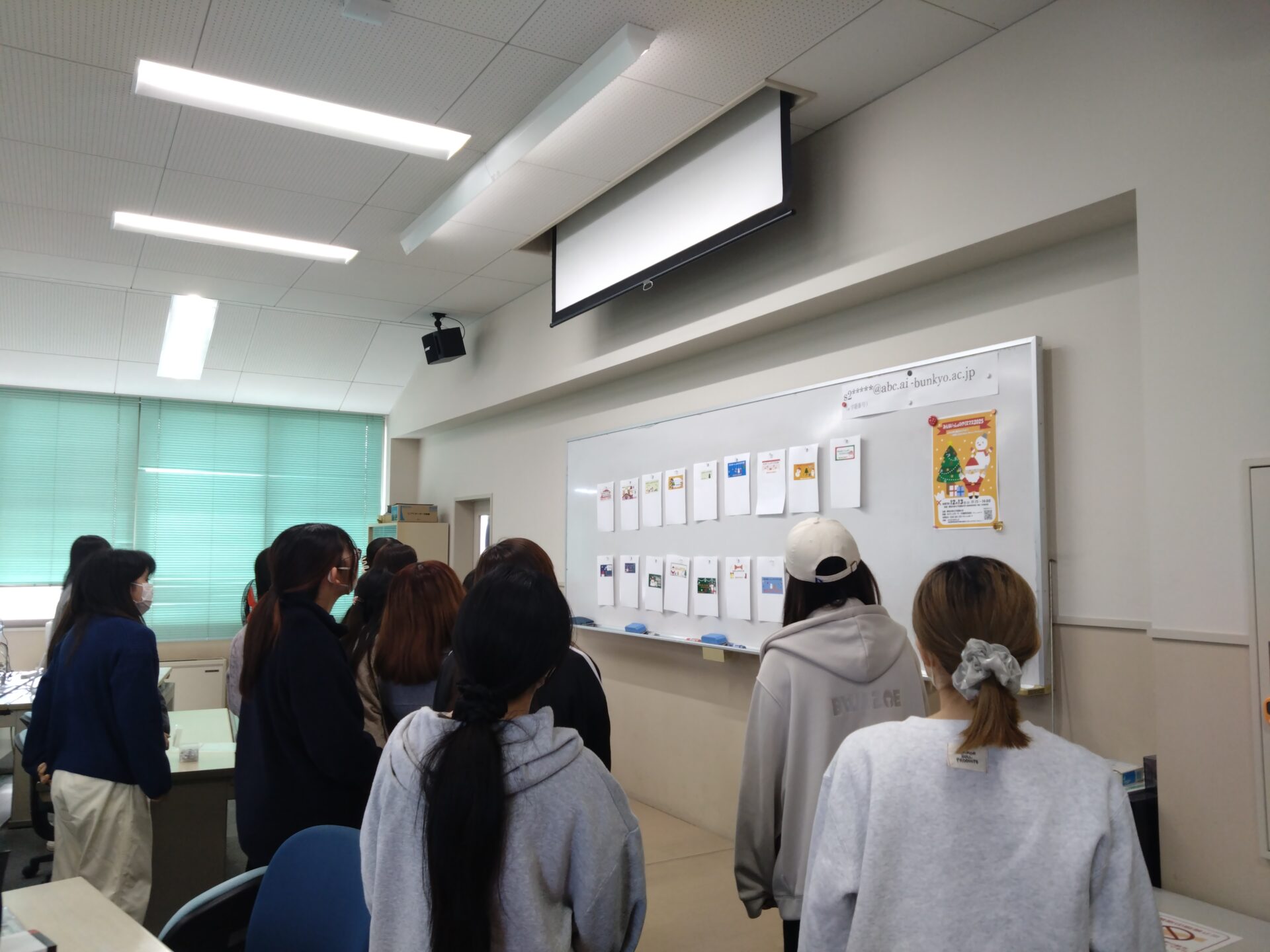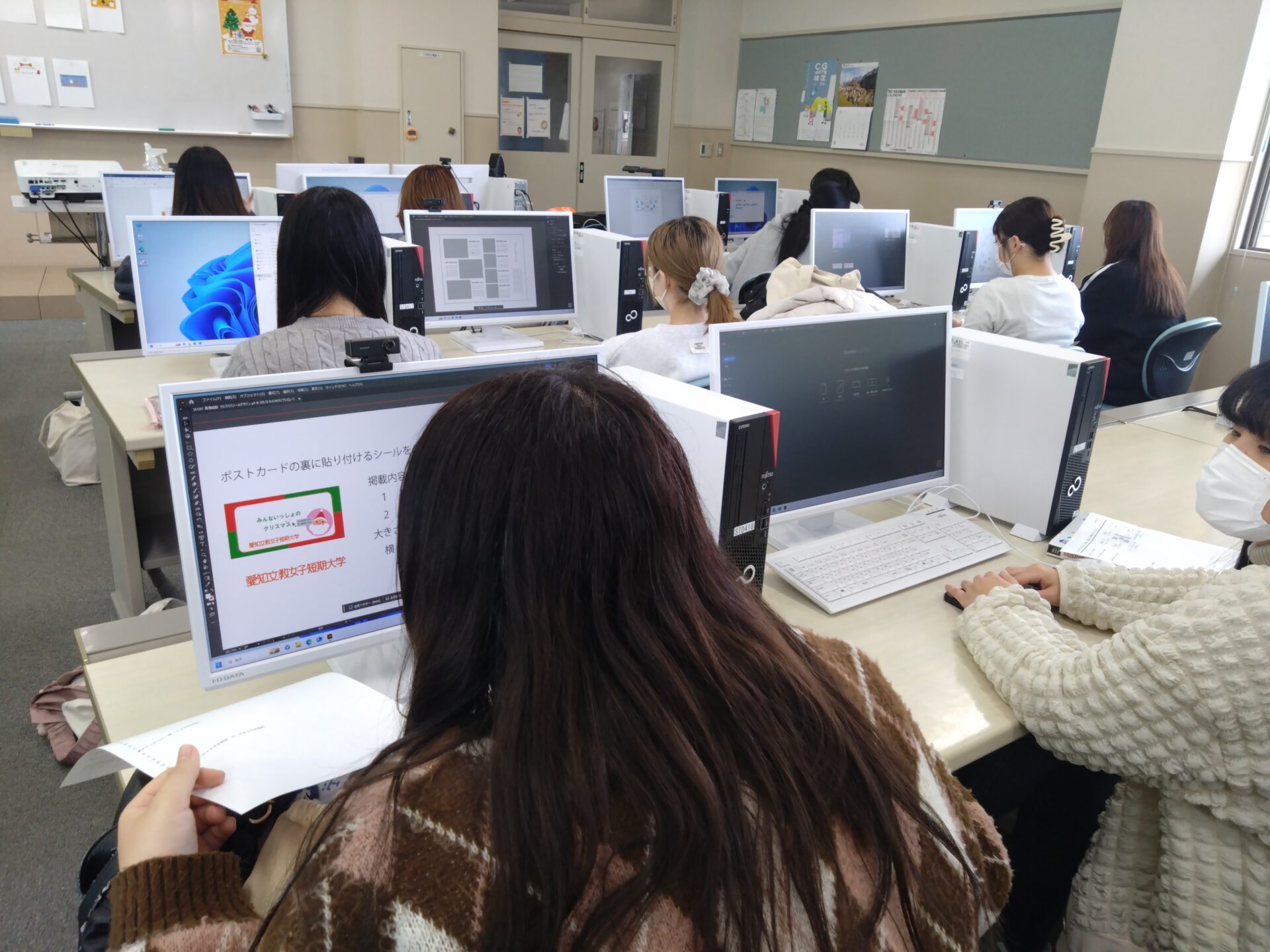 「食物アレルギーの子どもとその家族を笑顔にしたい」「安心して食事をとることの幸せを思う存分味わってもらいたい」という思いから、2003年より毎年開催している愛知文教女子短期大学ならではの「みんないっしょのクリスマス」のイベント。生活文化専攻の学生たちは、ポスターの制作や、当日使用するランチョンマット、ツリーに飾ってプレゼントにするポストカードなどの制作をCG演習の授業で、イラストレータのソフトを使ってデータを作成しました。