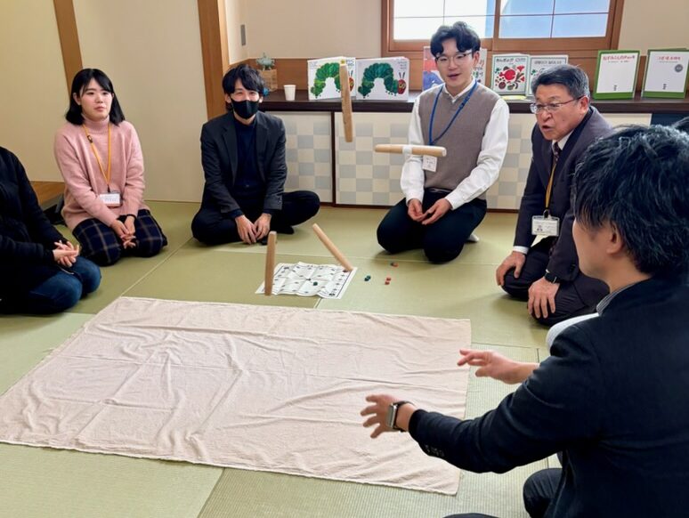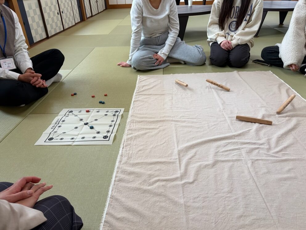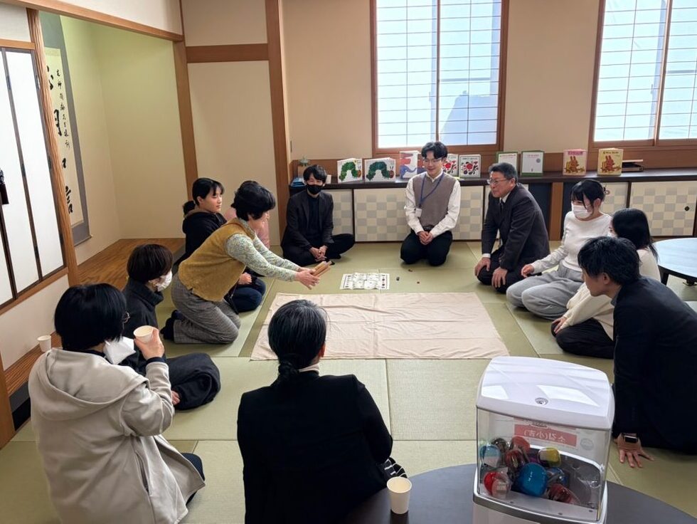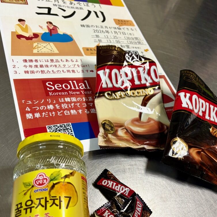 1月の「教職員と学内交流会」は、韓国のお正月あそび「ユンノリ」でした。学内の和室で、ゆず茶を飲みながら、まるでお家にいるみたいな時間を過ごしました。