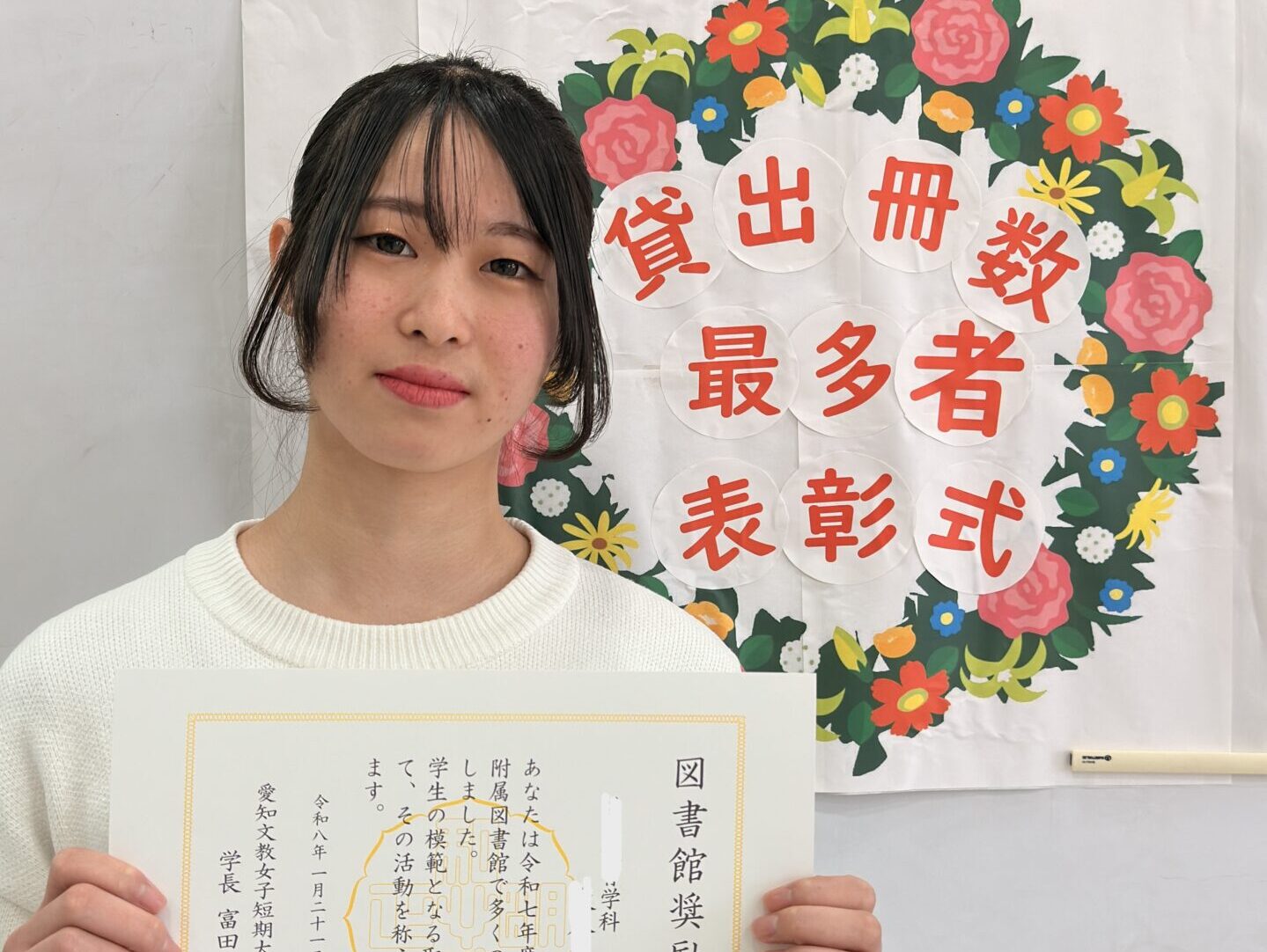 今年度、100冊以上の貸出しを達成されたのは、幼児教育学科の学生さんでした。学生のうちにこれだけ多くの本と出会い、学びを深められたことは、本当に素晴らしいことです。読書の積み重ねが、きっと将来の保育現場や人生の糧になってくれると思います。