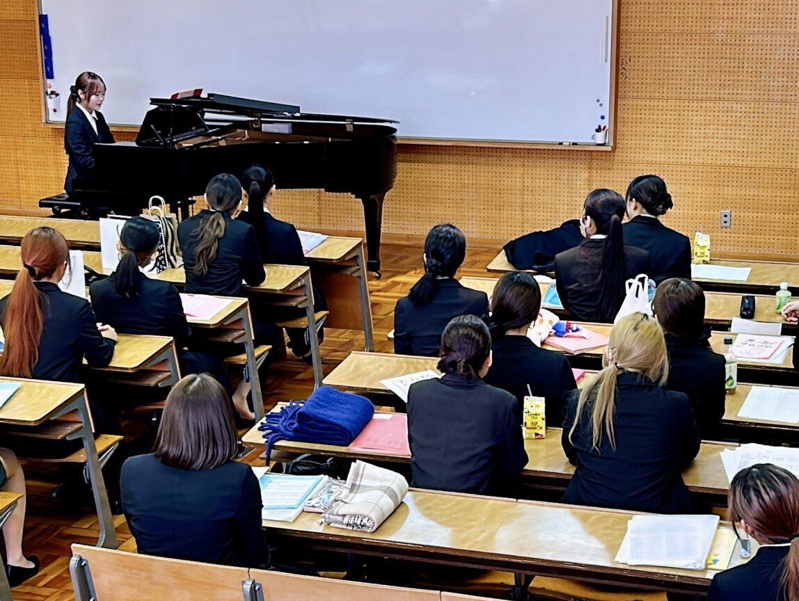 ピアノ発表会は、将来の就職試験を想定し、スーツとパンプスを着用して実施しています。服装から姿勢、立ち居振る舞いまで、すべてが実践的な学びにつながっています。