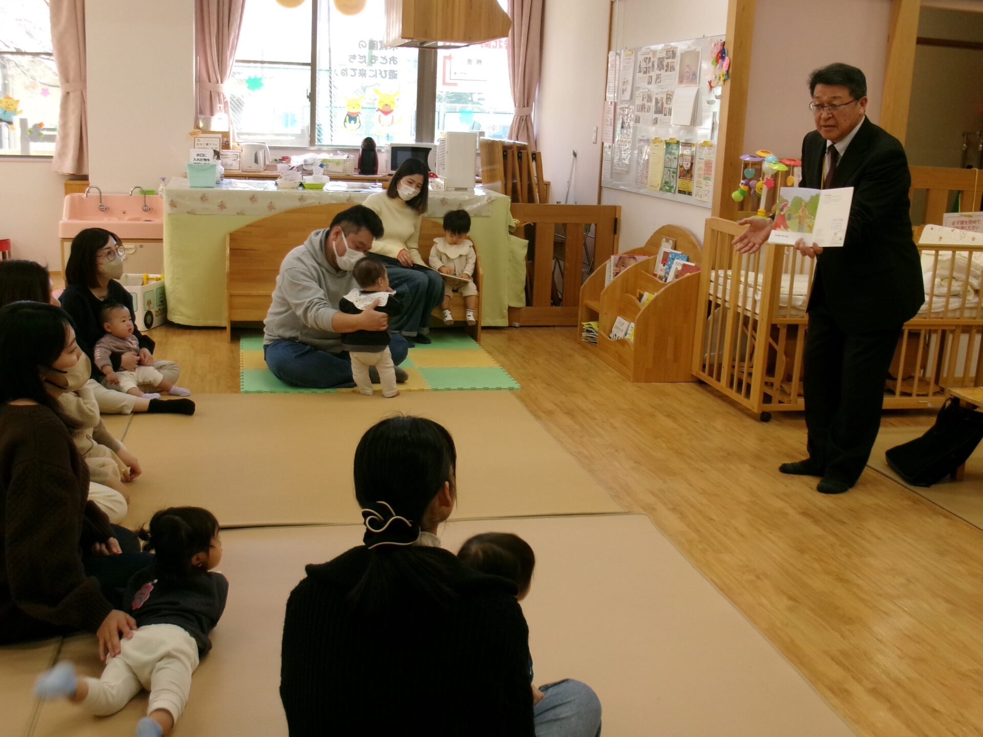 短大内にある子育て支援施設「文教おやこ園」にて、幼児教育学科の英語担当・山崎先生による英語絵本の読み聞かせが行われました。