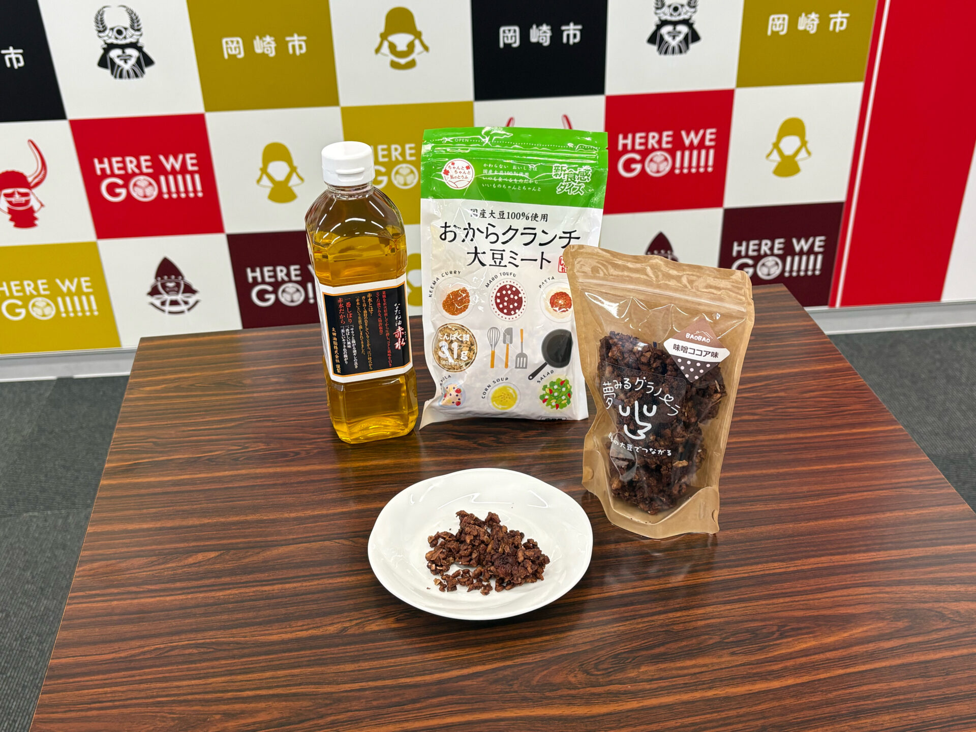 岡崎市の魅力がぎゅっと詰まった新商品「夢みるグラノーラ 味噌ココア味」の完成報告のために、2026年3月19日に、産学福連携先のおとうふ工房いしかわ、太田油脂株式会社、就労継続支援B型事業所BAOBAOの家の方と一緒に岡崎市長を表敬表問しました。