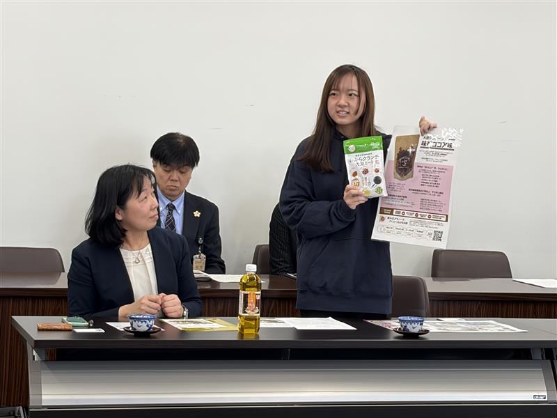 学生から商品のコンセプトや開発の背景について説明を行いました。地元・岡崎市の特産や魅力を活かしながら、誰もが楽しめる新しい味として生まれたこのグラノーラには、多くの想いが込められています。