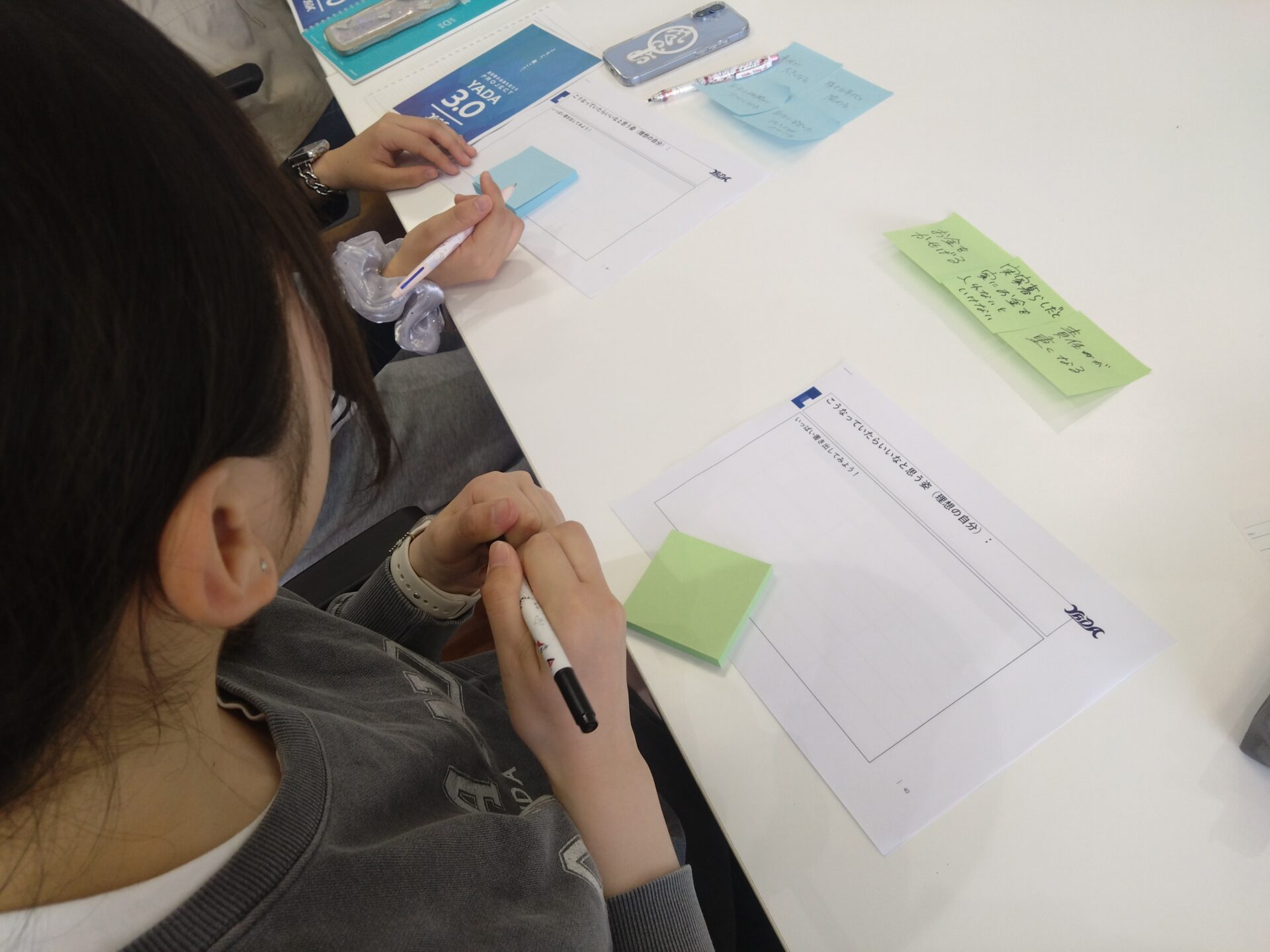 講座では、ただ話を聞くだけでなく、ワークを通して自分自身と向き合う時間が設けられ、学生たちは「これからどんな自分になりたいのか」という問いに対し、頭の中だけで考えるのではなく、付箋に書き出したり、言葉にして共有したりすることで、自分の考えを整理していきました。
